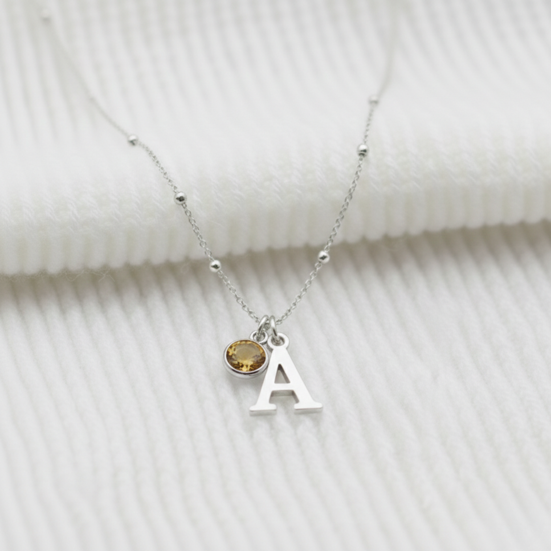 A little golden glow, just for her, this personalised November birthstone and initial necklace captures her story in sterling silver and citrine, a tiny spark of joy she can wear close every single day.