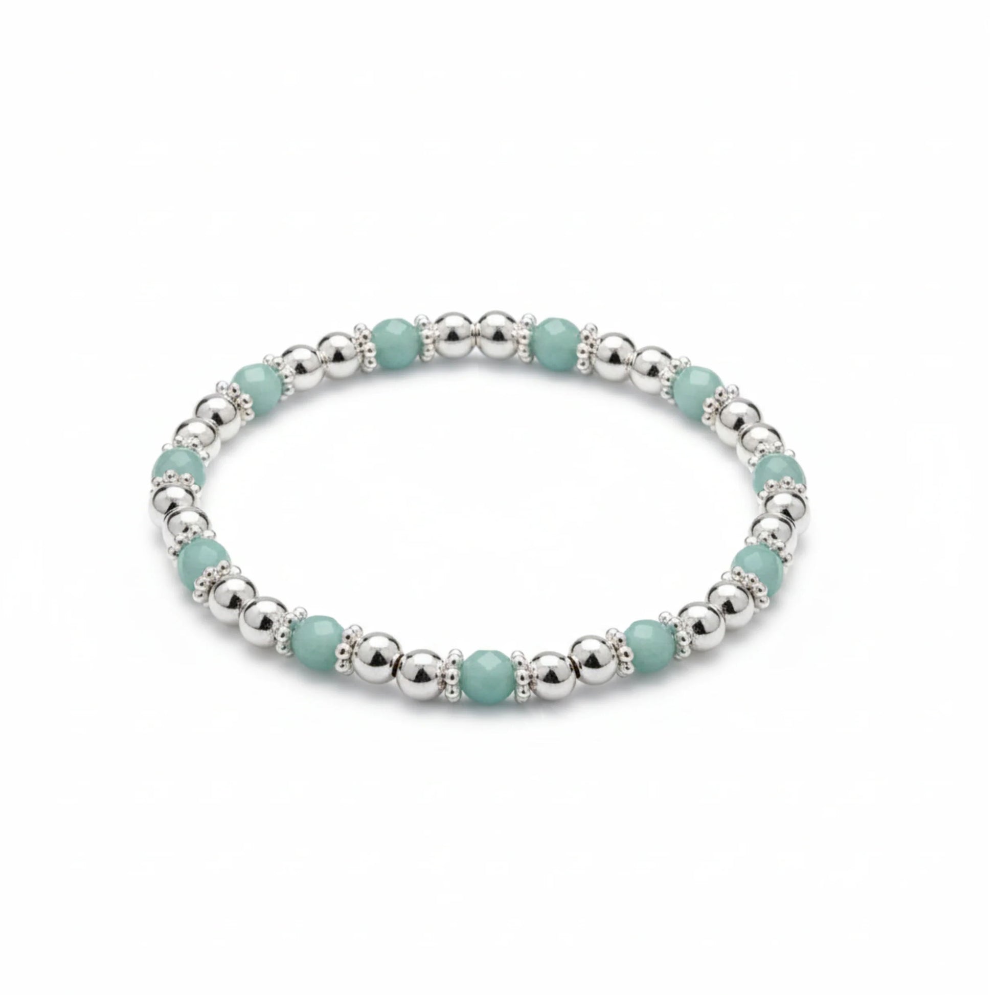 Our Beautiful Amazonite Bracelet is handcrafted using sterling silver beads, sterling silver daisy spacers, finished with semi-precious Amazonite gemstones.